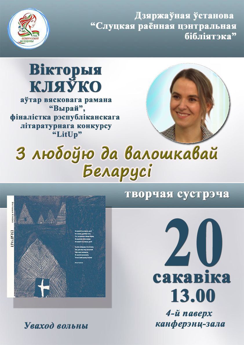 20 марта в 13:00 в Слуцкой районной центральной библиотеке состоится встреча с Викторией Клевко, писательницей, автором проекта о белорусской культуре и искусстве «МоноЛИТ36», основательницей книжного клуба, организатором литературных квартирников в легендарном писательском доме на Маркса, 36, дизайнером и блогером.