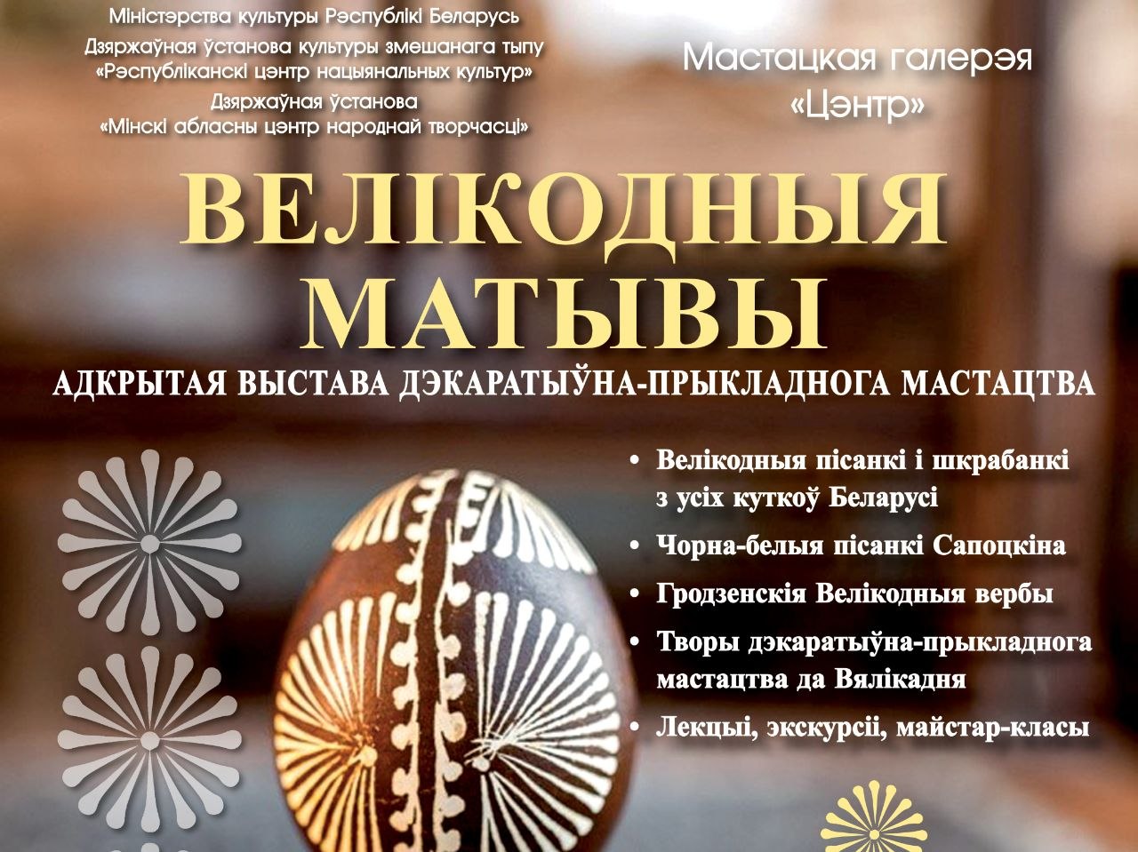 26 сакавіка ў мастацкай галерэі Мінскага абласнога цэнтра народнай творчасці а 15-й гадзіне адбудзецца вернісаж адкрытай выставы дэкаратыўна-прыкладнога мастацтва «Велікодныя матывы».